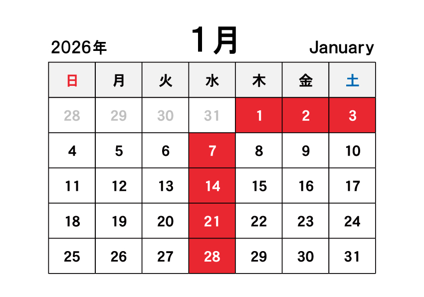 休業日 1/1、1/2、1/3、1/7、1/14、1/21、1/28